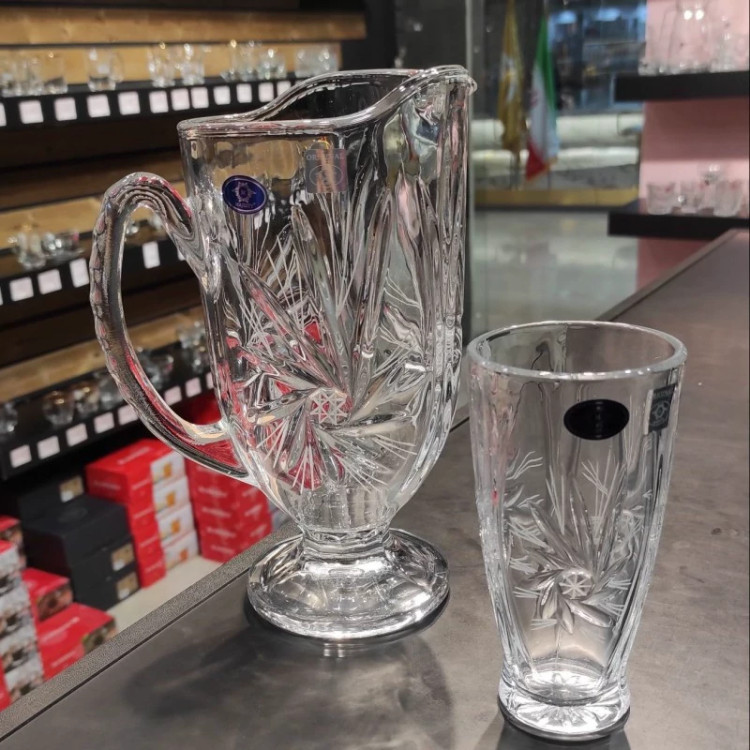 ابعاد پارچ: قطر دهنه 12cm – ارتفاع 24cm ابعاد لیوان: قطر دهنه 7.5cm – ارتفاع 14cm